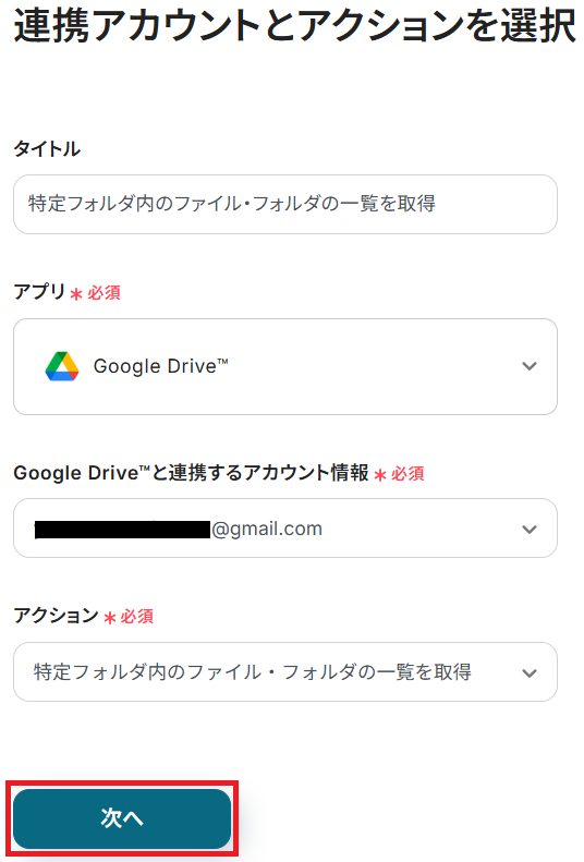 タイトルと連携するアカウント情報を任意で設定し、アクションはテンプレート通りに「特定フォルダ内のファイル・フォルダの一覧を取得」のまま「次へ」をクリックします。
