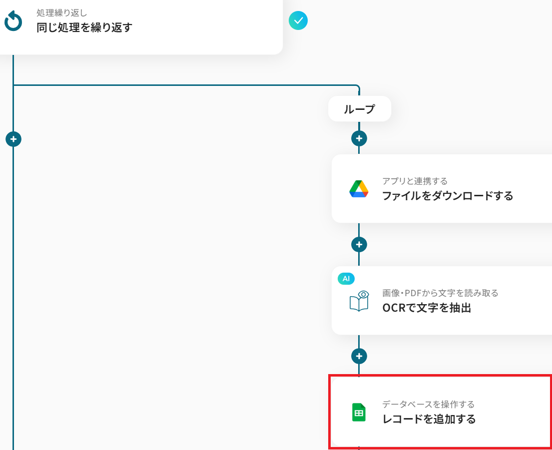 ファイル情報とそのOCR結果を、Google スプレッドシートに1つずつ追記する設定をします。
