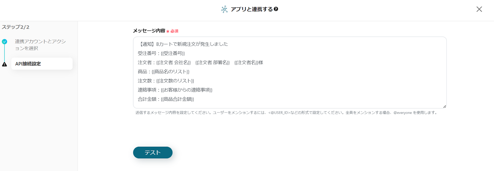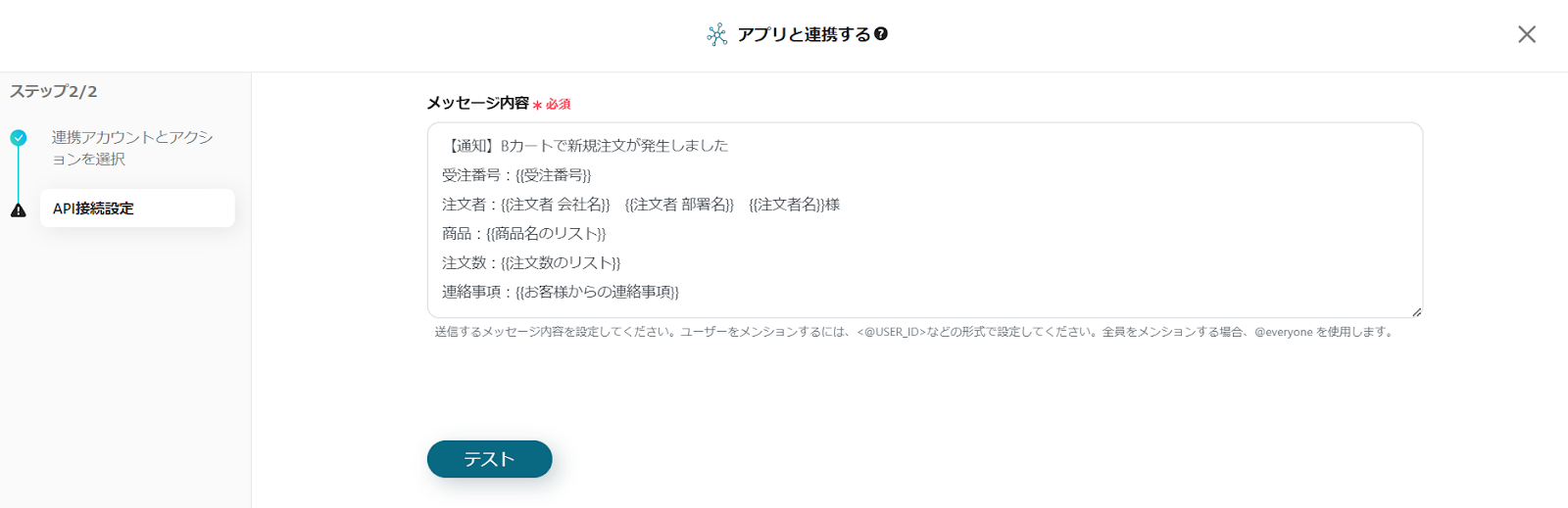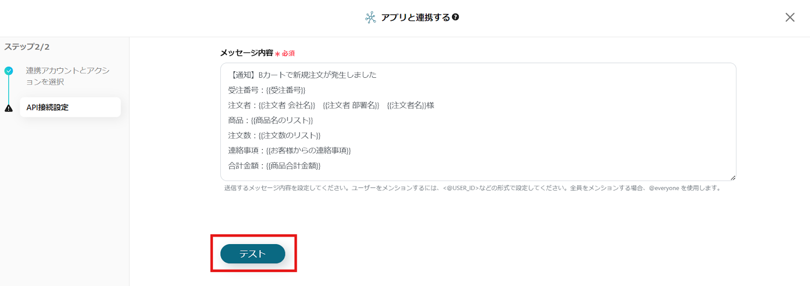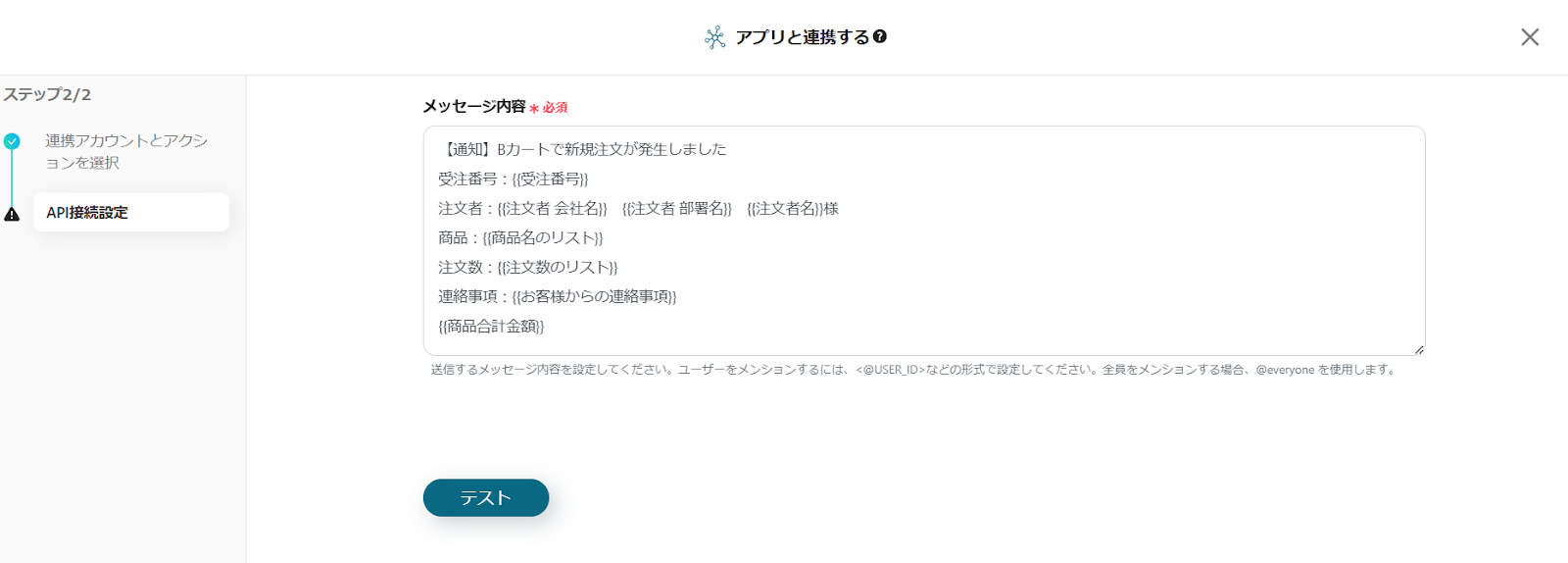 メッセージの設定ができたら、下部にあるテストボタンを押してください。
