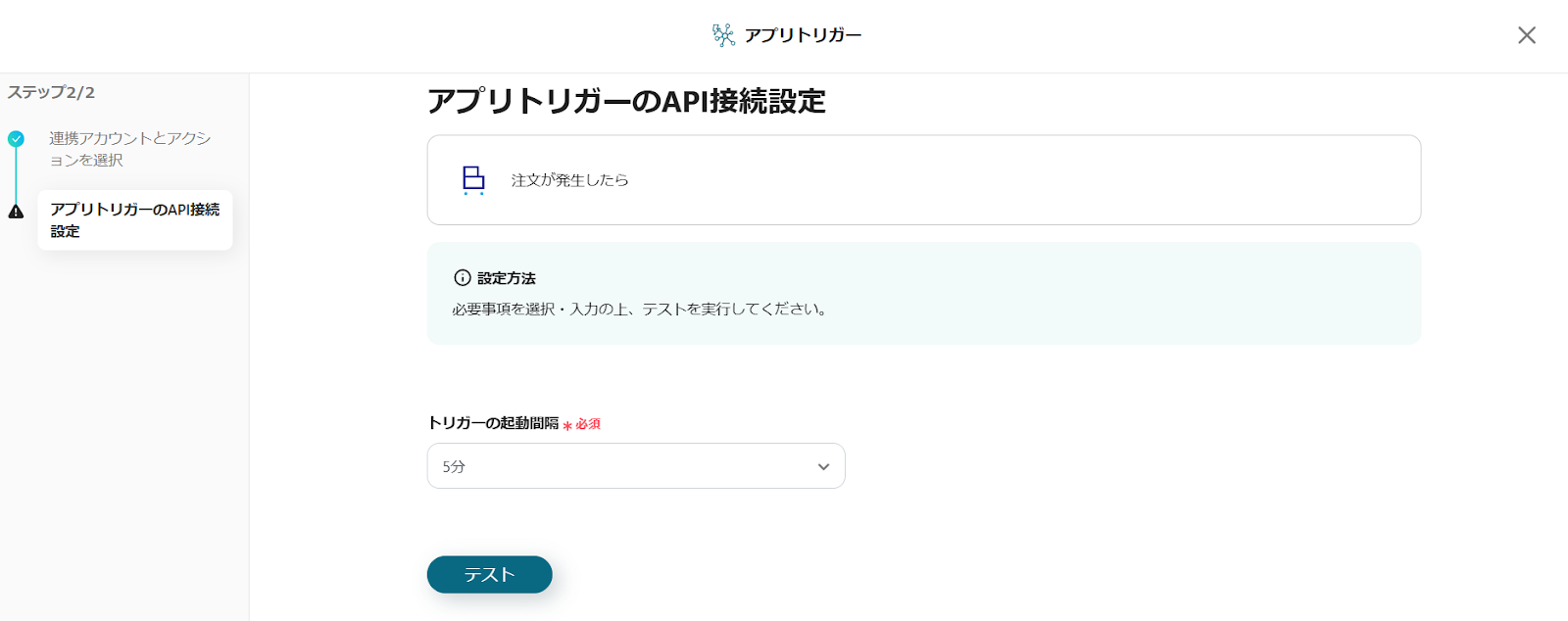 ※直近1時間以内に注文がない場合はテストに失敗する場合があるため、テスト用の注文を行うことをおすすめします。