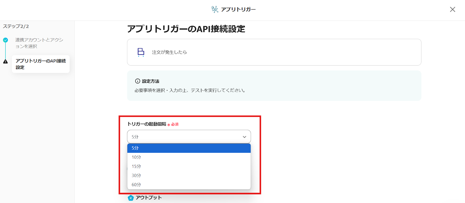 トリガーは5分、10分、15分、30分、60分の間隔で起動間隔を選択できます。