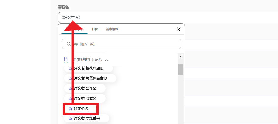 例えば、以下のように設定すると、kintoneに注文者名をBカートのアウトプットから選択することができます。