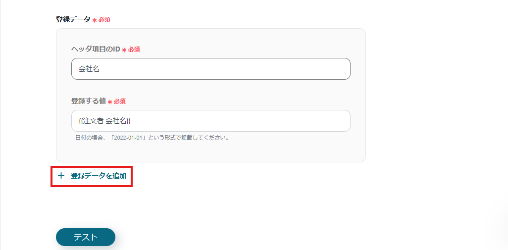 その他にも、項目を追加したい場合は「+登録データを追加」をクリックします。