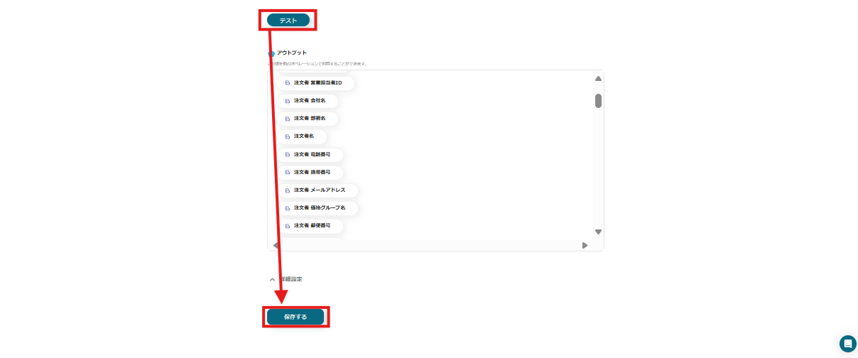 テストを実行すると、先ほど登録したBカートの注文情報がアウトプットに表示されるので、確認できたら「保存する」を押してください。