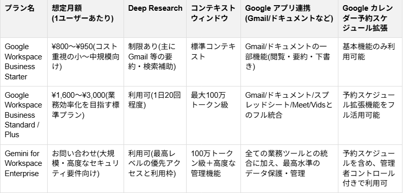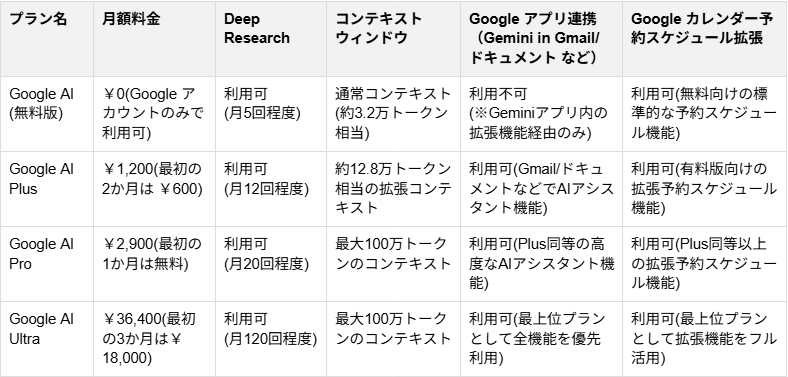 3.情報収集力の高さと柔軟な料金体系 Google検索と連動しているため、他のAIツールと比較して、特定の税法や過去の裁決事例を調べる際の情報収集力 に優れています。官公庁の発表などを素早く検索し、根拠となる情報にアクセスしやすくなります。 また、手軽な無料版だけでなく、より高度な推論機能を利用できたり、Google Workspaceアプリ(Gmailやドキュメント等)内で直接AIを呼び出せる有料プランも用意されています。