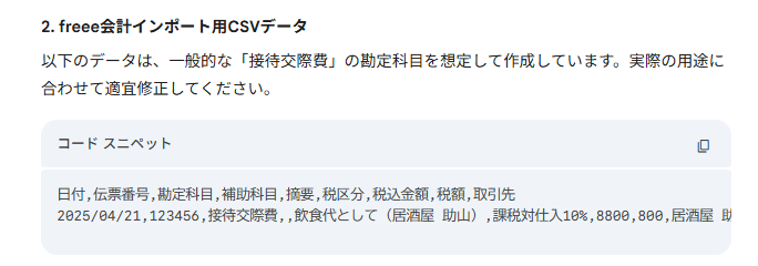 領収書画像を読み取り、まずは以下の項目を表形式で抽出してください。 ・日付 ・金額(税込) ・消費税額 ・支払先(店舗・会社名) ・内容(但し書き) そのうえで、freee会計にインポートできることを想定した仕訳データを、CSV形式で作成してください。 CSVのカラムは次のとおりにしてください。 「日付,伝票番号,勘定科目,補助科目,摘要,税区分,税込金額,税額,取引先」