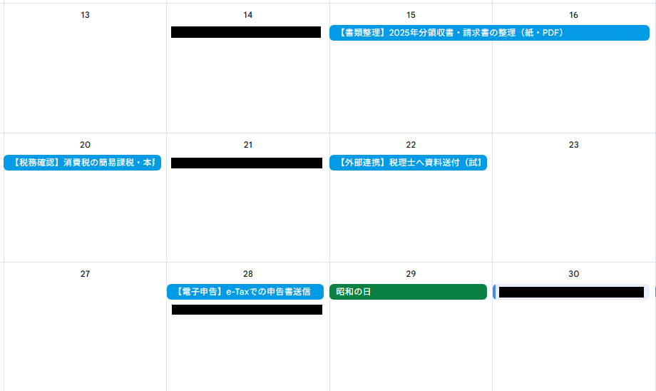 【タスク一覧】 ・2025年分の領収書・請求書の整理(紙&PDF) ・税理士への資料送付(試算表、総勘定元帳、固定資産台帳) ・電子申告(e-Tax)での申告書送信 ・消費税の簡易課税/本則課税の判定と確認 #要求1:タスク整理 上記タスクを、カテゴリ分けして整理してください。 #要求2:スケジュール案 次に、2026/04/15〜2026/04/30の期間をベースに、Googleカレンダーに登録してください。