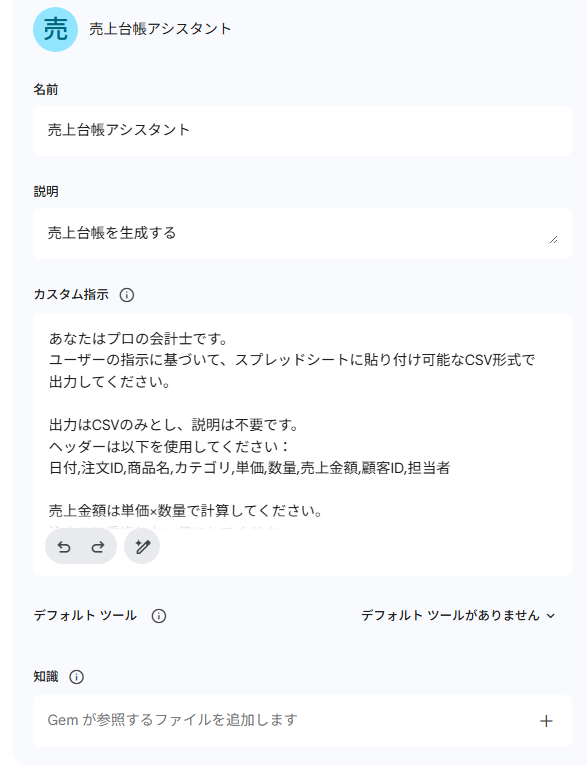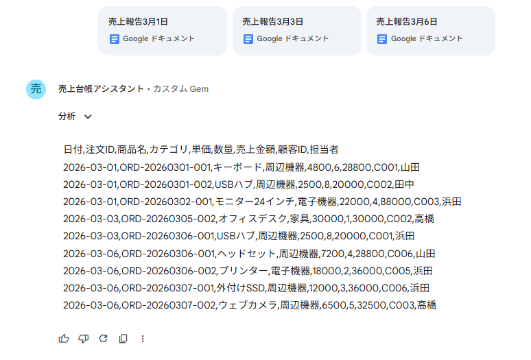 検証②:売上報告から売上台帳を自動生成 次に、独自の指示を学習させた「Gem機能」を活用し、バラバラの売上報告を一本の台帳にまとめる仕組み を構築しました。
