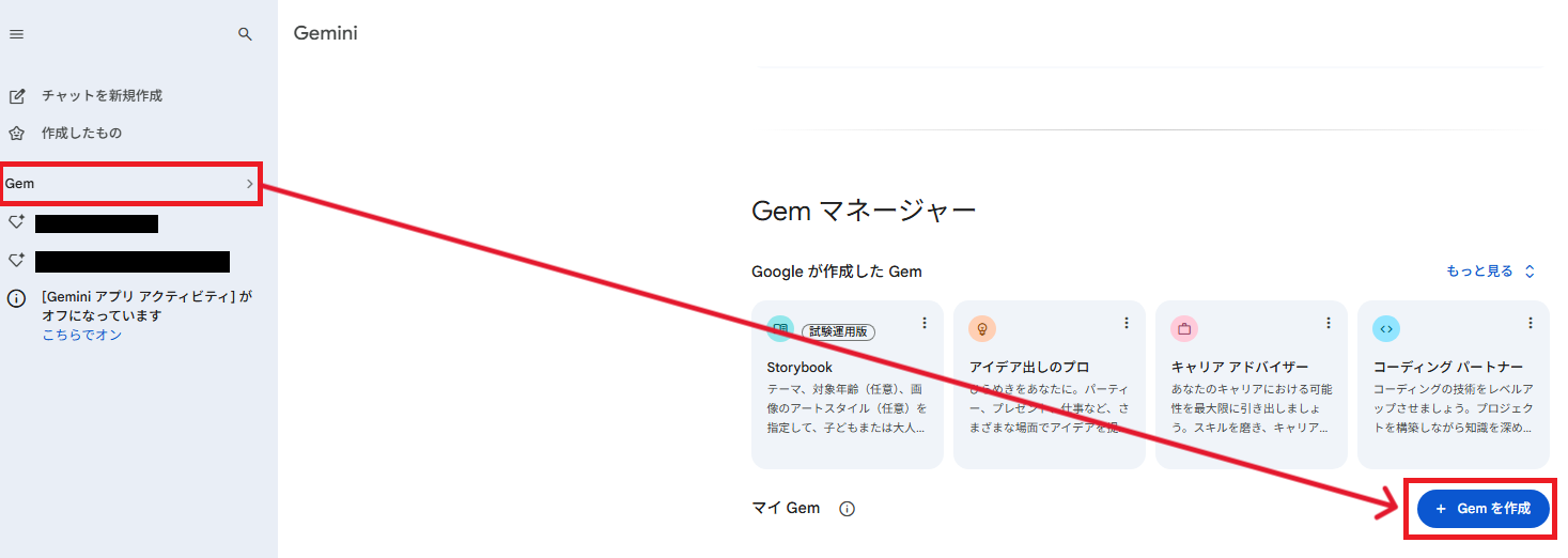 1.画面左側の「Gem」から「Gemを作成」を選択。