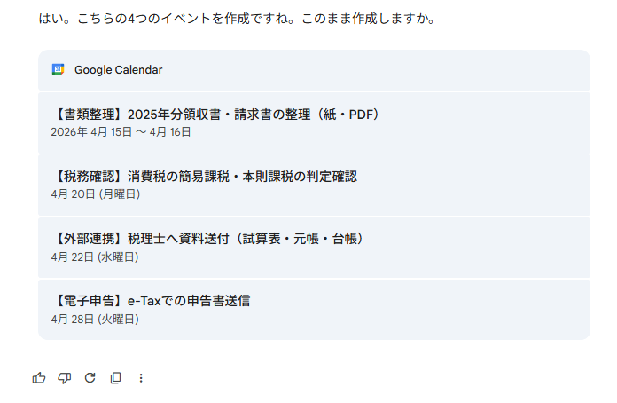 提案された内容を確認し、作成を指示するとそのままGoogleカレンダーに登録されるため、個別に予定を入力する手間は一切不要 です。 「次に何をすべきか」を考える脳の負担が大幅に軽減され、経理担当者が本来注力すべき実務判断や確認作業に、より深く集中できる環境が整います。
