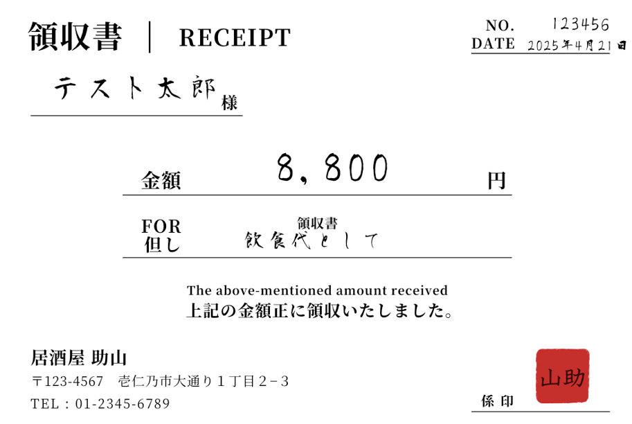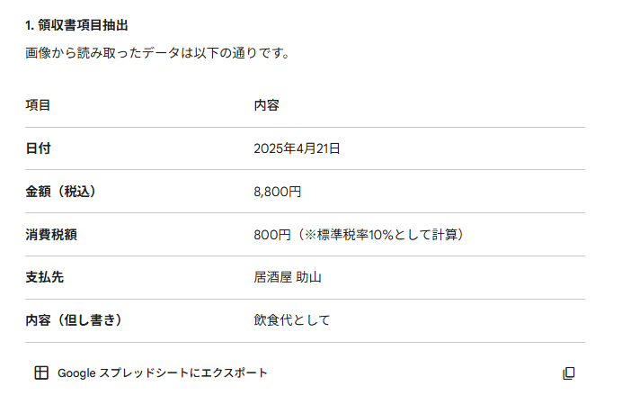 検証結果 細かい文字やかすれた印字であっても、極めて高い精度で読み取りに成功 しました。 特筆すべきは、消費税額の記載がないケースでも、一般的な飲食店で適用される標準税率10%を前提に、税込8,800円から消費税800円を自動算出 した点です。