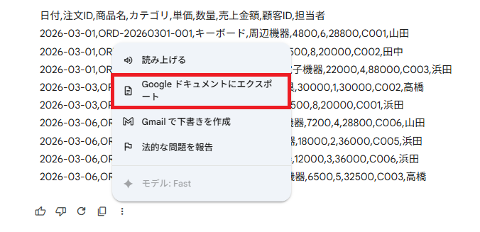 Gemini上でまとめられたデータは、そのままGoogleドキュメントへエクスポートすることも可能です。これにより、手作業による転記漏れを完全に防止できます。プロンプトを設定する手間も不要のため、売上管理のスピードが劇的に向上 し、管理業務の「淀み」が解消されることを確認しました。