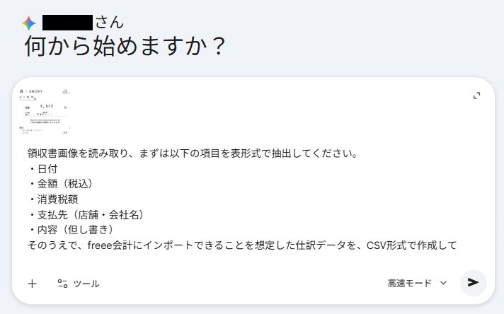 検証①領収書画像から会計ソフト用データを作成 まずは、仕訳の自動化 を検証しました。 手書き風の領収書をGeminiに読み込ませ、以下のプロンプトで抽出とCSV生成を指示しています。