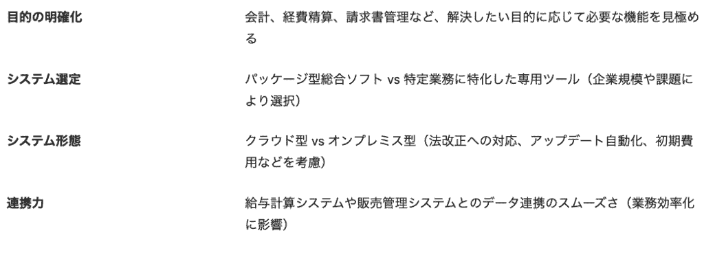 数ある経理DXツールの中から自社に最適なものを選ぶためには、いくつかの重要なポイントを押さえておく必要があります。