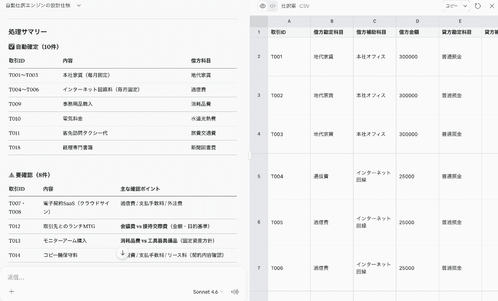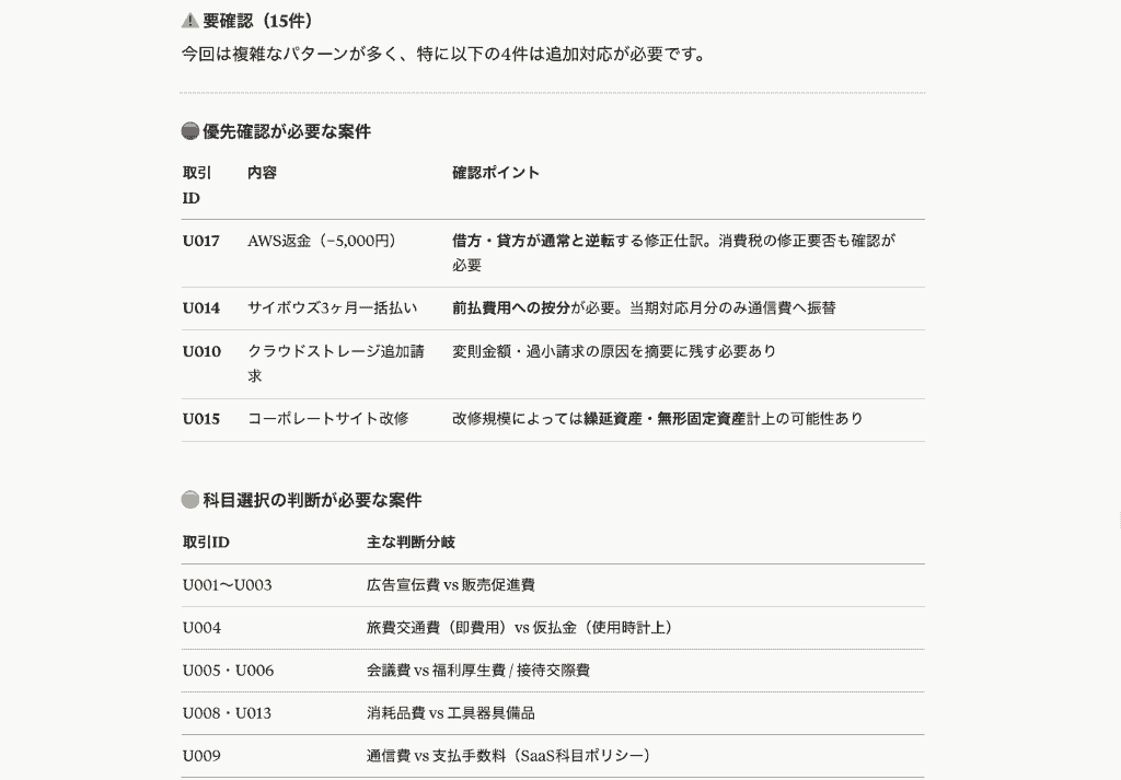 ・不明な点があっても、必ず何らかの勘定科目を提案したうえで、「要確認」フラグとコメントで不確実性を示してください。