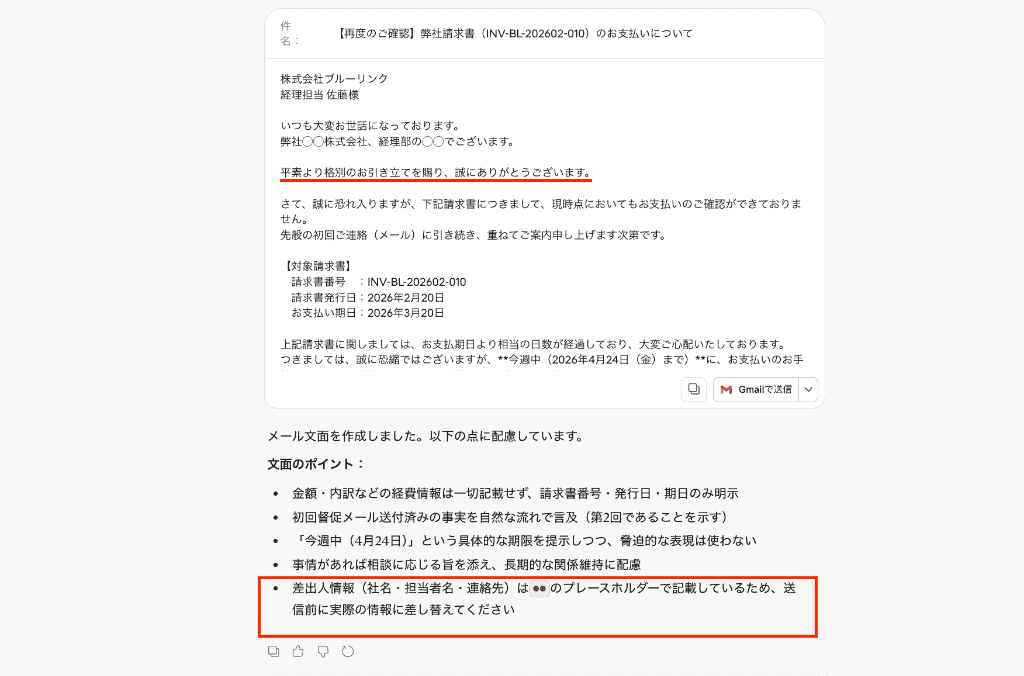 また、メール構成のポイントも合わせて生成してくれているので、補足すべき対応がすぐにわかるようになっています。(赤枠)