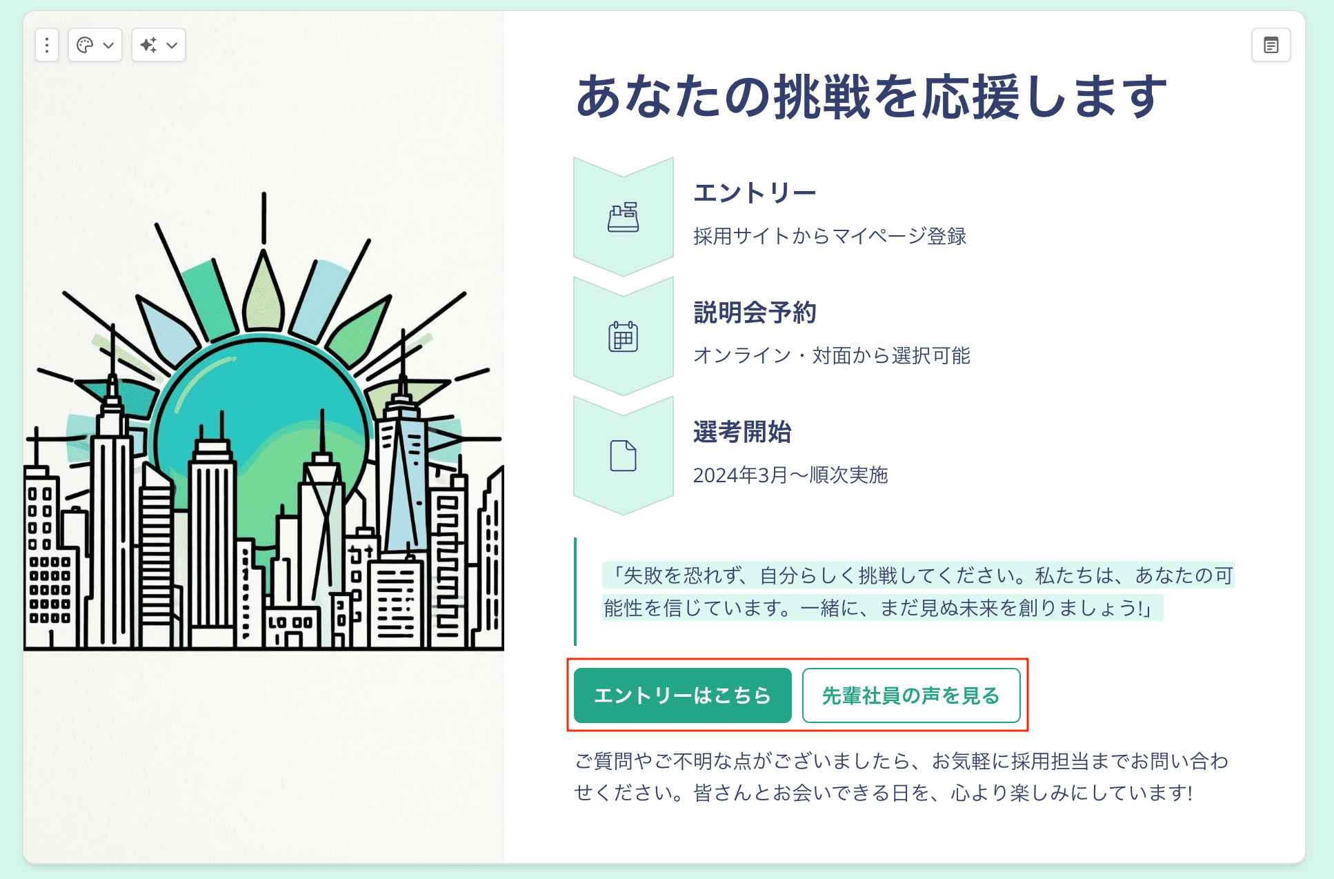 最下部に配置された「エントリーはこちら」「先輩社員の声を見る」といったボタンは、実運用ではリンクとして機能します。