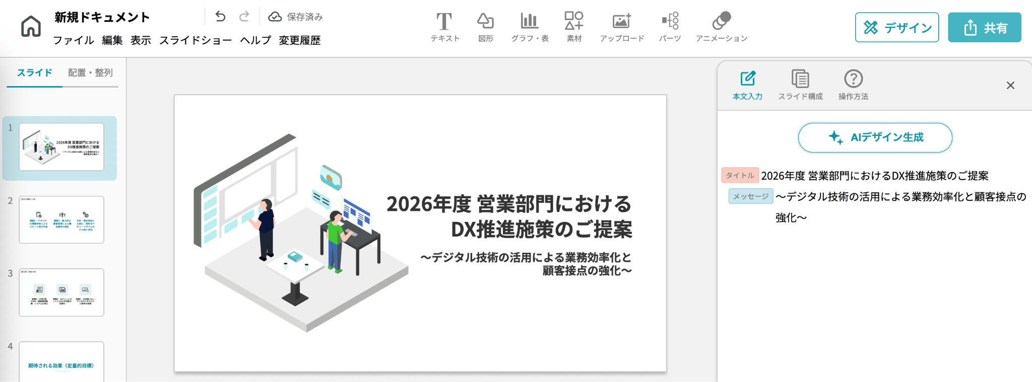 1枚目のアイソメトリック(斜め上からの視点)イラストや、シンプルで清潔感のある配色、そして最後にしっかりと「結び」の言葉が添えられた構成は、社内提案だけでなくクライアント向けの資料としても通用するクオリティです。複雑な操作をせずとも、プロフェッショナルな整った資料が完成する点は大きな魅力と言えます。
