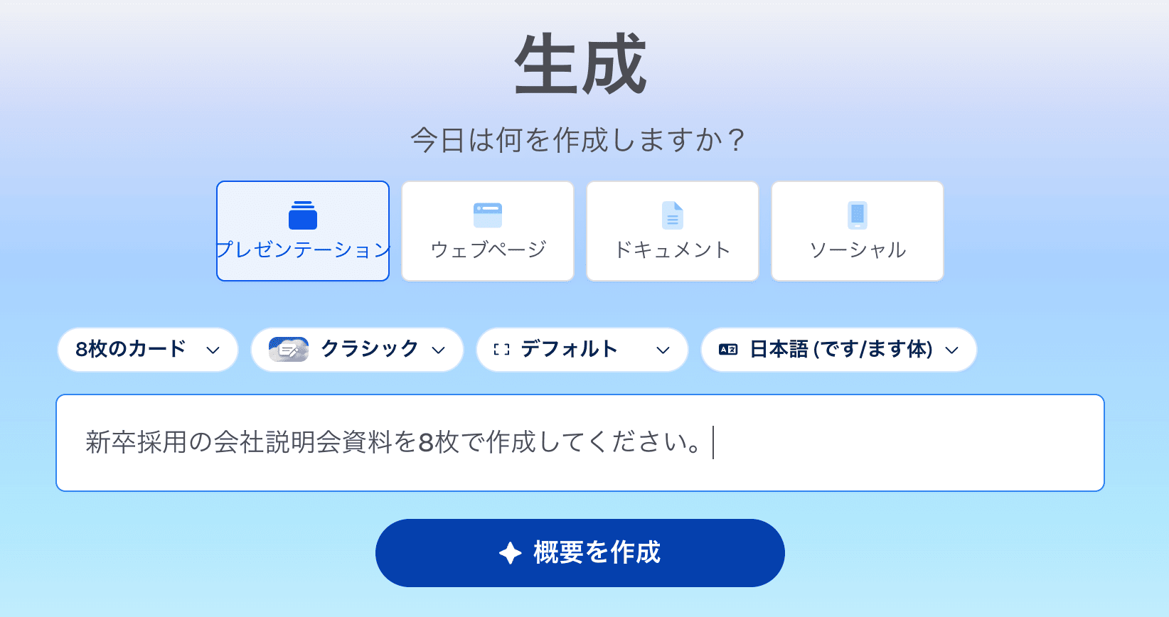 まずは、Gamma(無料版)を使って、キーワードからの瞬発力を検証します。