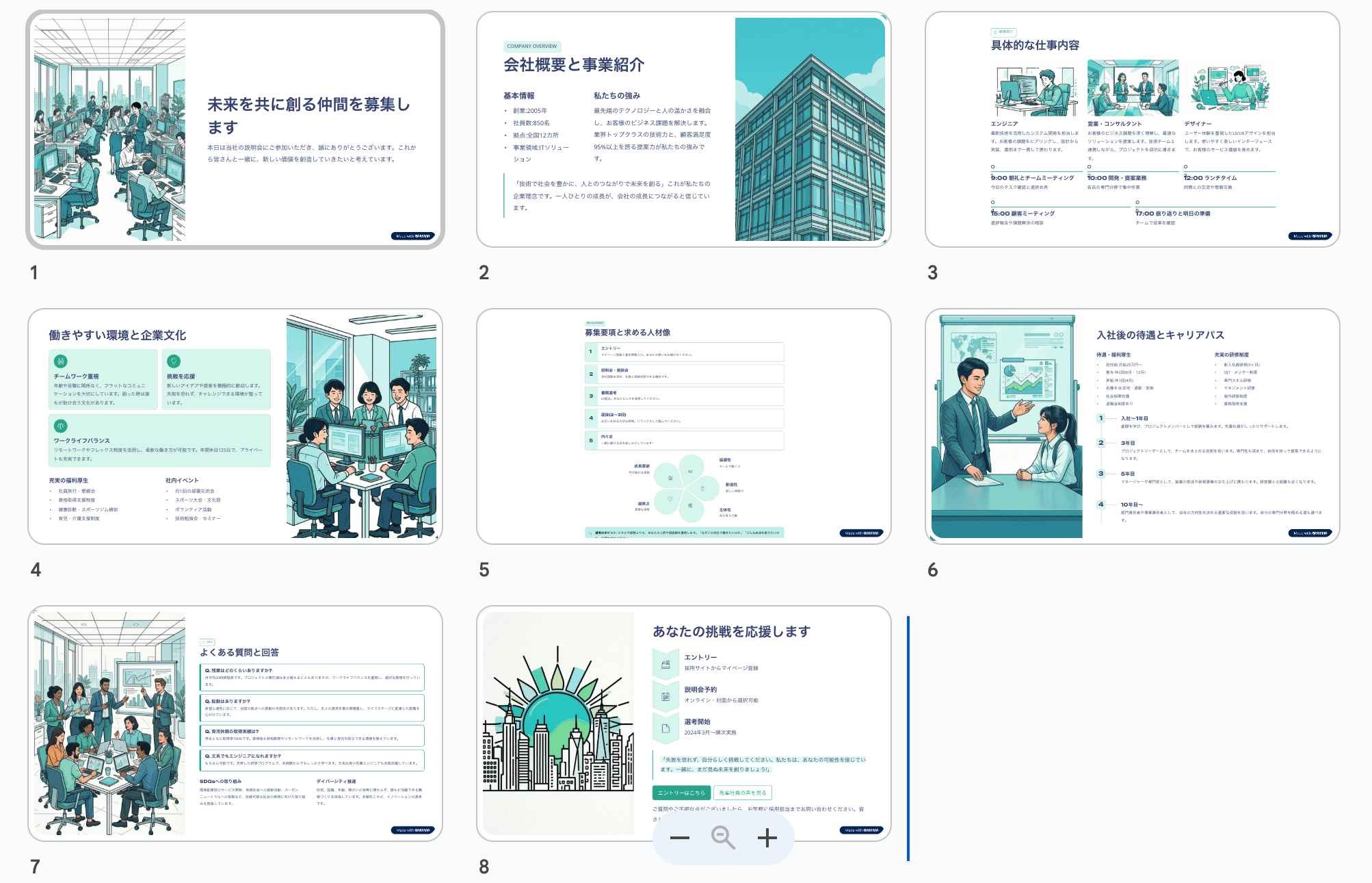 新卒採用の会社説明会資料を8枚で作成してください。