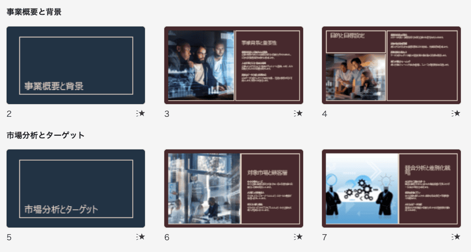 Wordで作成された「新規事業企画書」の論理構造を正確に読み取り、主要なセクションを漏れなくスライドに変換しています。特に、スライドの各ページが一つの重要な論点に対応しており、ドキュメントに基づいたスライド構成が高い精度で実現されています。