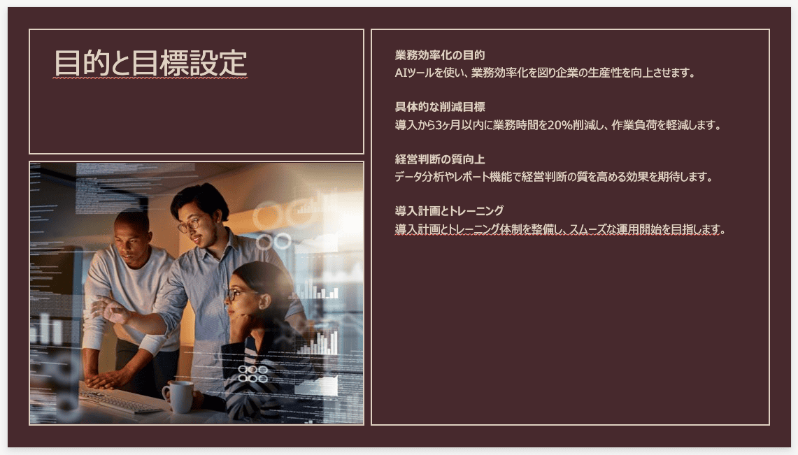 国産ツールならではの強みが顕著に表れています。タイトルの改行位置やフォントのバランスが自然で、違和感がありません。課題や施策といった3つのポイントを並べる際も、適切なアイコンとセットで等間隔に配置されており、一目で構造が理解できるビジネス文書の基本が自動で押さえられています。