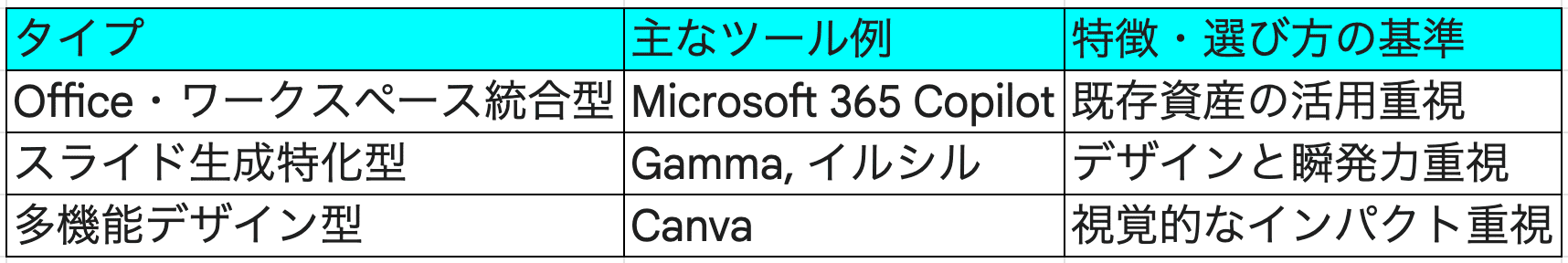 一口に資料作成AIと言っても、その特性はツールによって大きく異なります。まずは、自分がどのタイプを求めているのかを整理してみましょう。