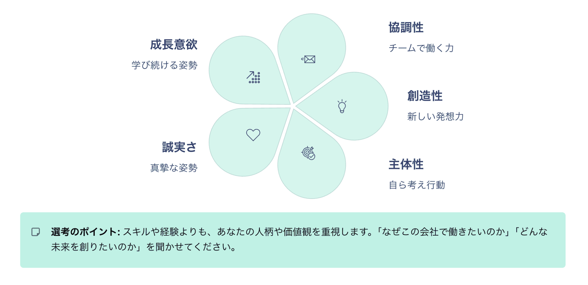 テキストの羅列になりがちな「求める人材像」を5枚の花びらのようなアイコンで表現したり、1日のスケジュールをステップ形式で配置したりと、直感的に理解できるレイアウトが自動選択されています。