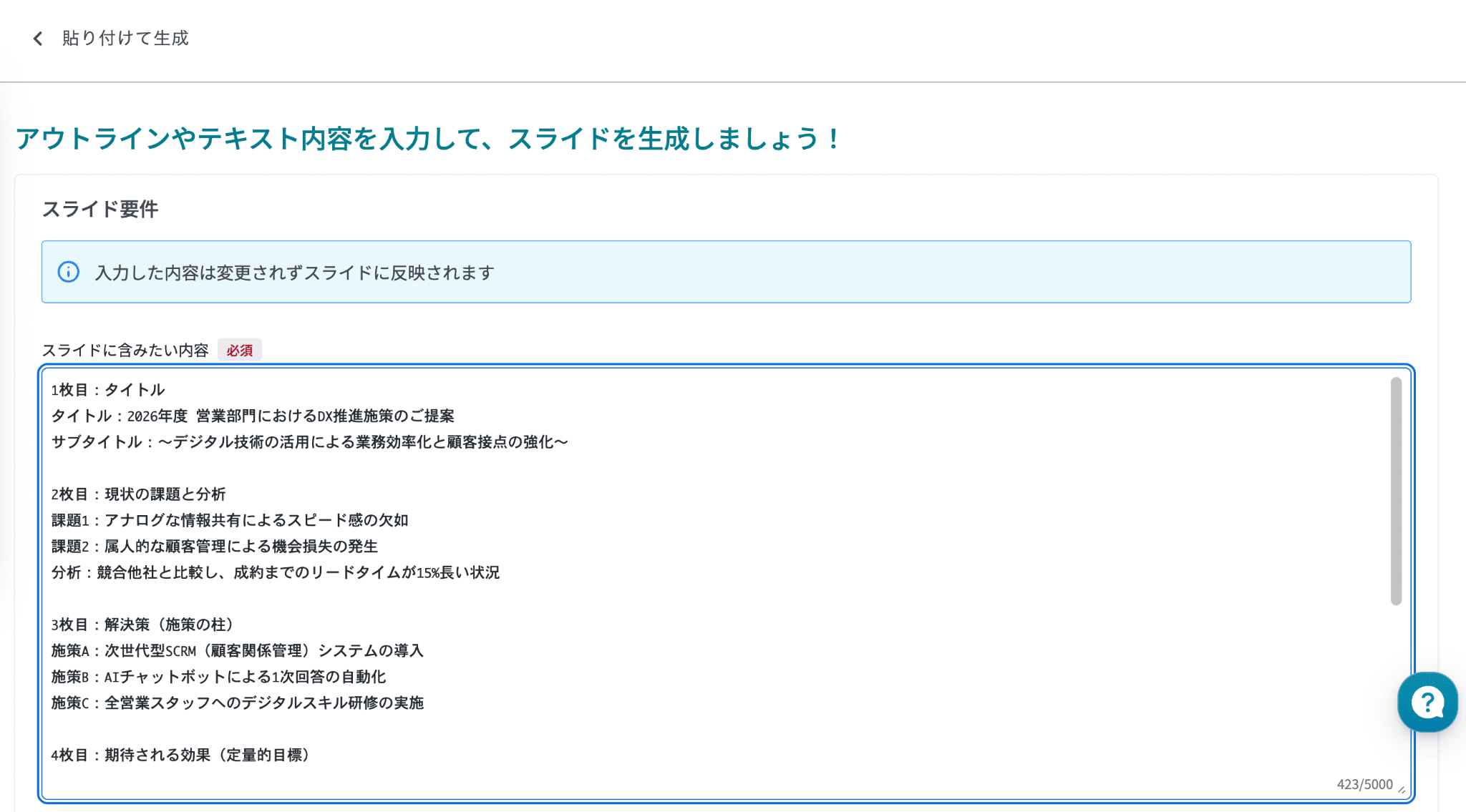 その構成案を資料作成AIに貼り付けて生成させることで、内容の深さとデザインの美しさを両立させられます。