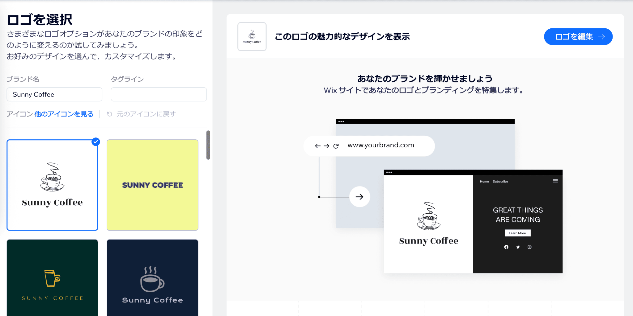 カフェのロゴを想定し、「Sunny Coffee」と入力して作成しました。