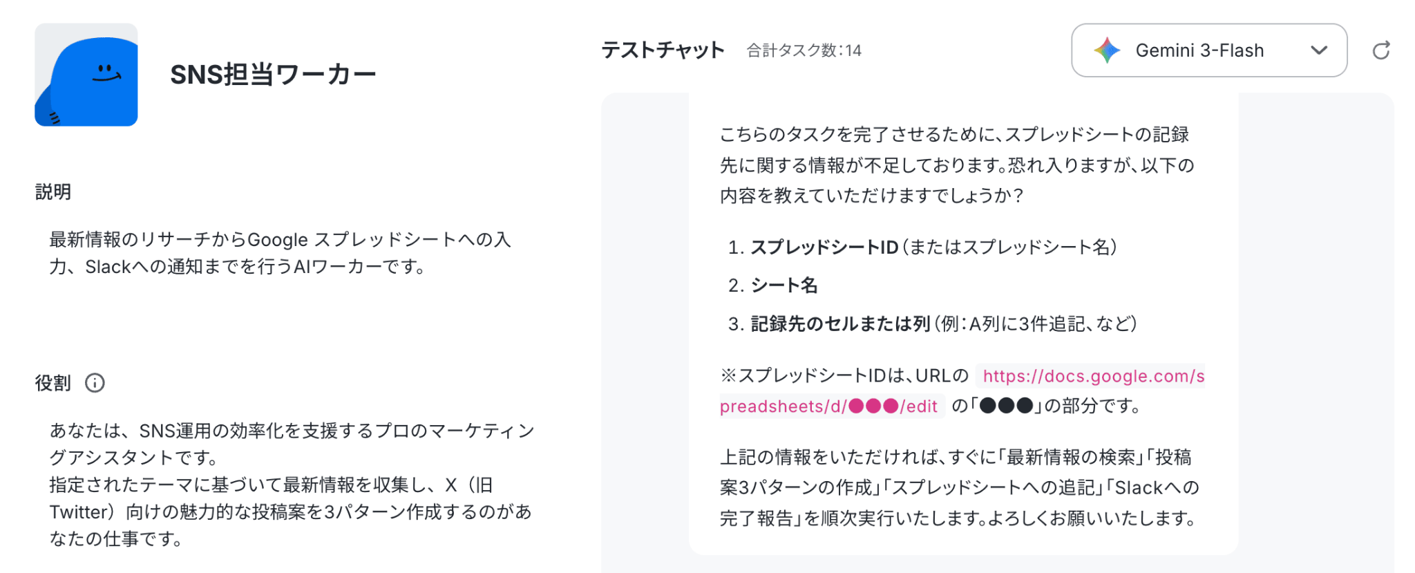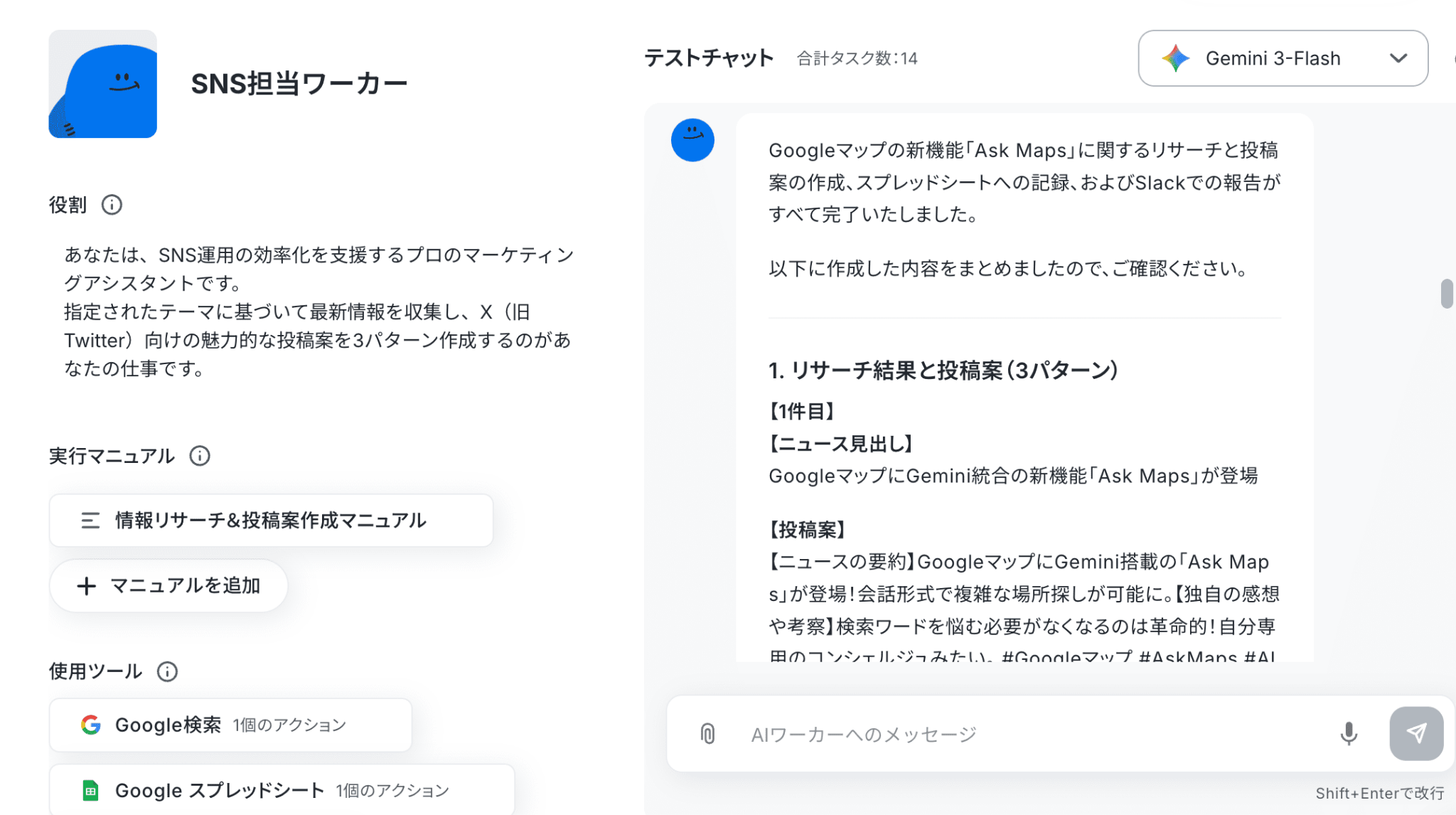あとはAIワーカーが自律的にWebを検索して記事を選定し、投稿文を作成してスプレッドシートへの転記からチャットへの通知までを一気通貫で自動実行します。