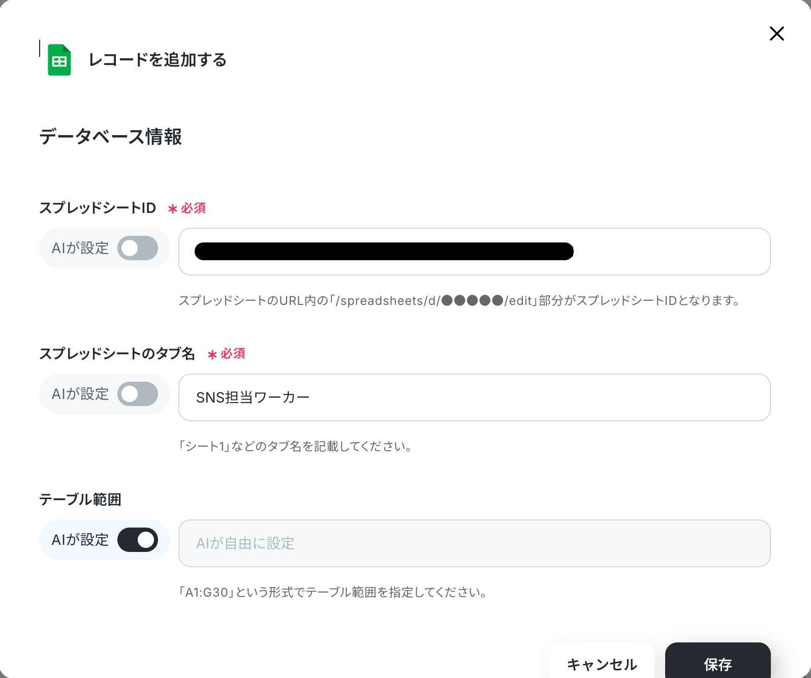 詳細設定では、任意のGoogle スプレッドシート(あらかじめ用意したもの)を指定するため、以下のように設定しました。