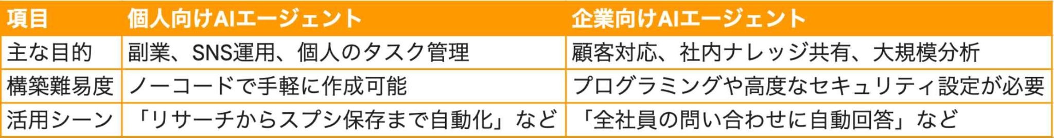 個人事業主やフリーランスにとって、自分専用のAIエージェントを持つことは、24時間稼働する業務サポートを、コストを抑えて導入できるようなインパクトがあります。