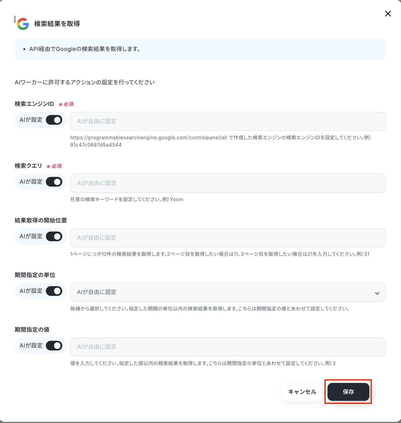 検索クエリなど、必要に応じて変更できますが、この記事ではAIワーカーに任せる設定で保存しています。