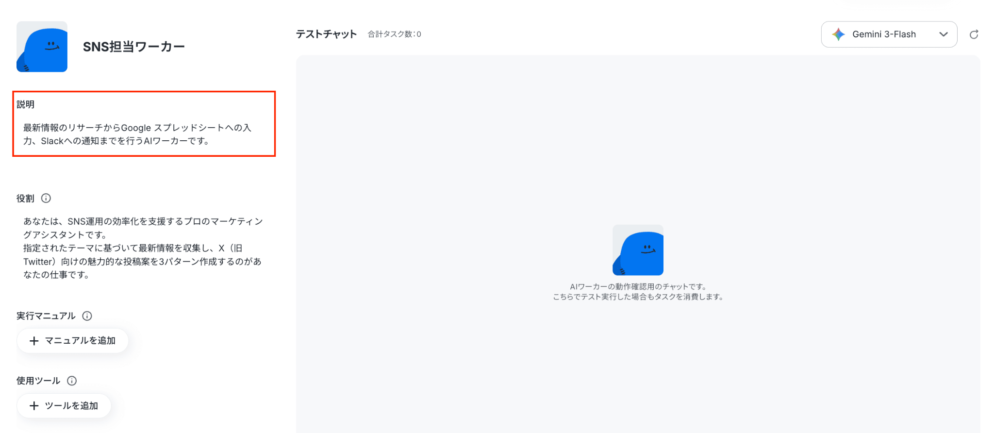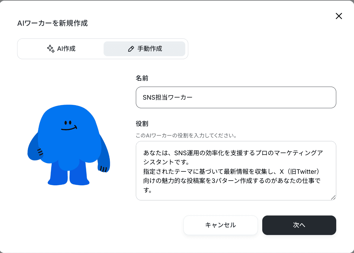 AIワーカーの名前を「SNS担当ワーカー」と設定し、アイコンも分かりやすいものを選びます。役割は、目的を明確に記載するのがポイントです。