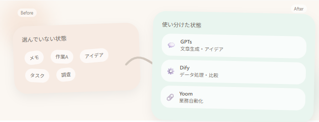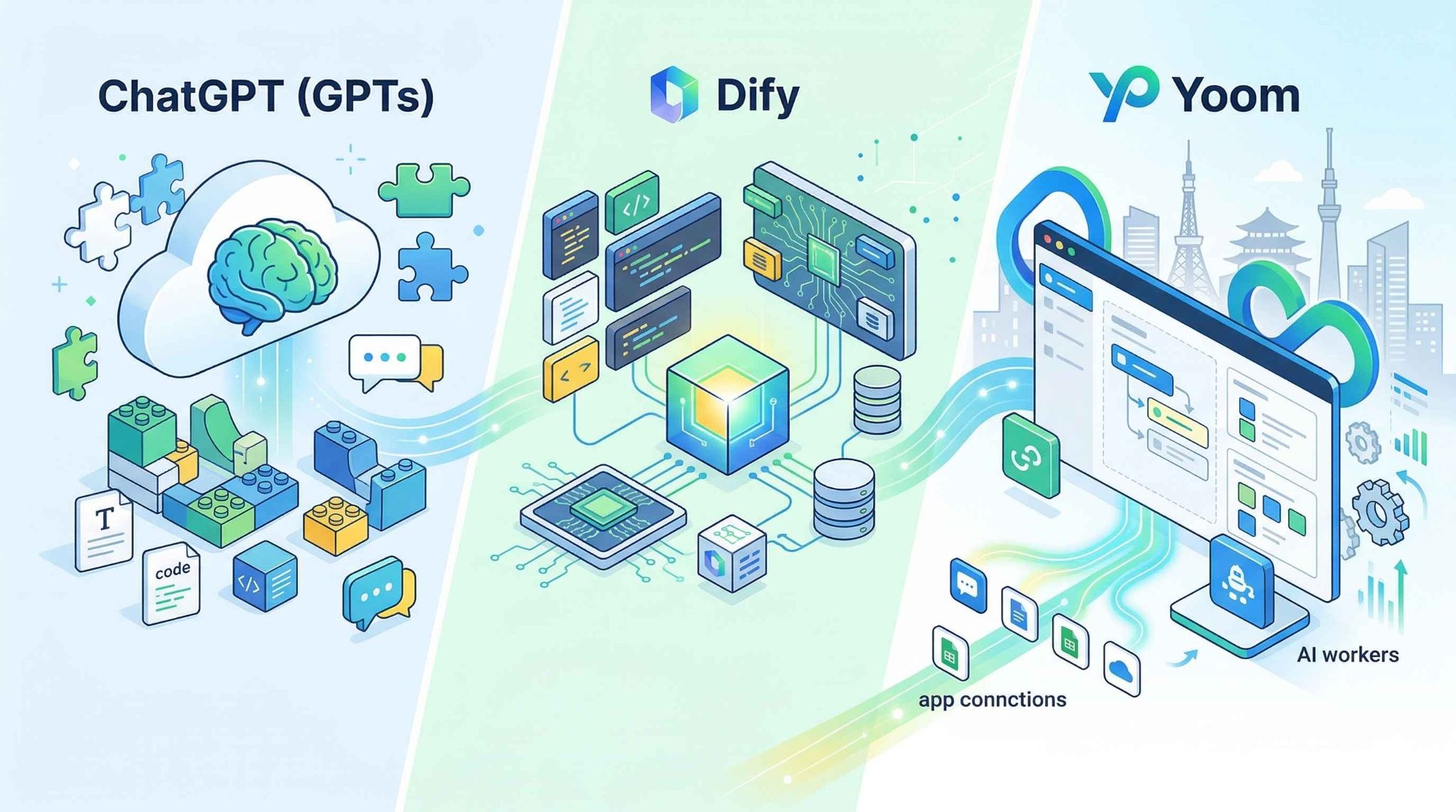 文章の生成やアイデア出しがメインであればGPTs、複雑なデータ処理や複数モデルの比較が必要ならDify、複数の日本のSaaSアプリを連携させて業務フローを自動化したいならYoom(AIワーカー)といった具合に、目的に応じて使い分けます。