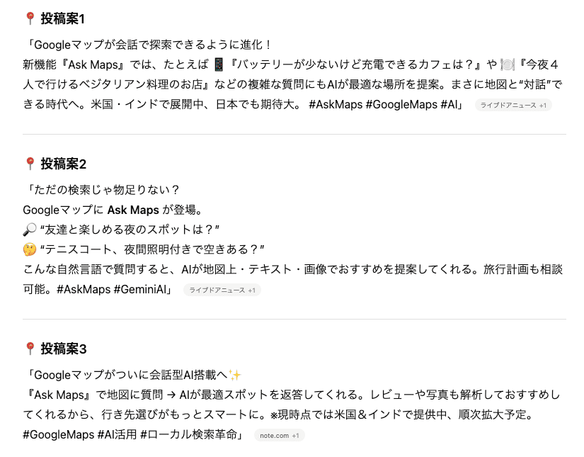 Googleマップの「Ask Maps」について最新情報を収集し、X(旧Twitter)向けの魅力的な投稿案を3パターン作成してください。