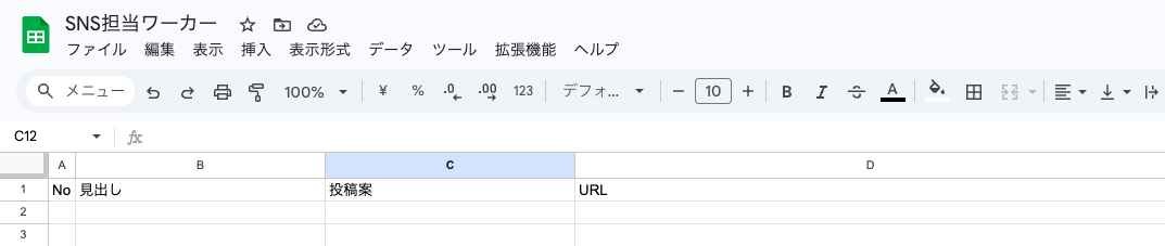 Google スプレッドシートを追加するにあたって、投稿案を入力するためのシートを準備しておきます。