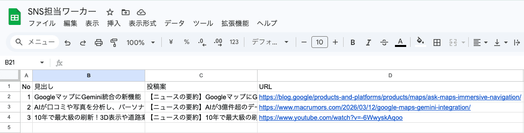 3. スプレッドシートへの記録: 作成した3件の投稿案を、Google スプレッドシートに追記してください。