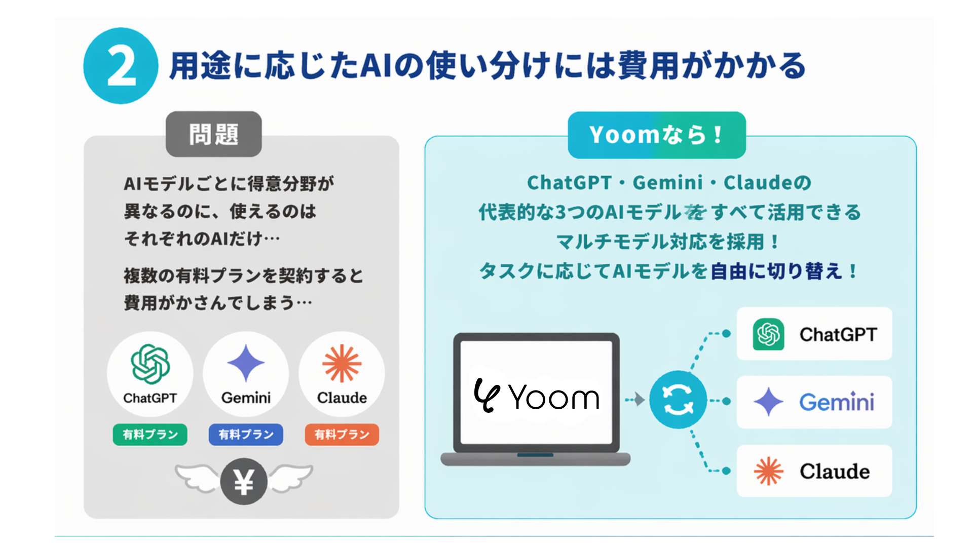 自然な日本語文の作成やコードの生成であればClaude、Google Workspaceとの連携であればGemini…というように、AIモデルの得意分野は異なります。しかし基本的にClaudeのツールであればClaudeモデルのみ、GeminiツールであればGeminiモデルしか使えず、それぞれのAIを有料プランで使用している場合は費用がかさんでしまいます。