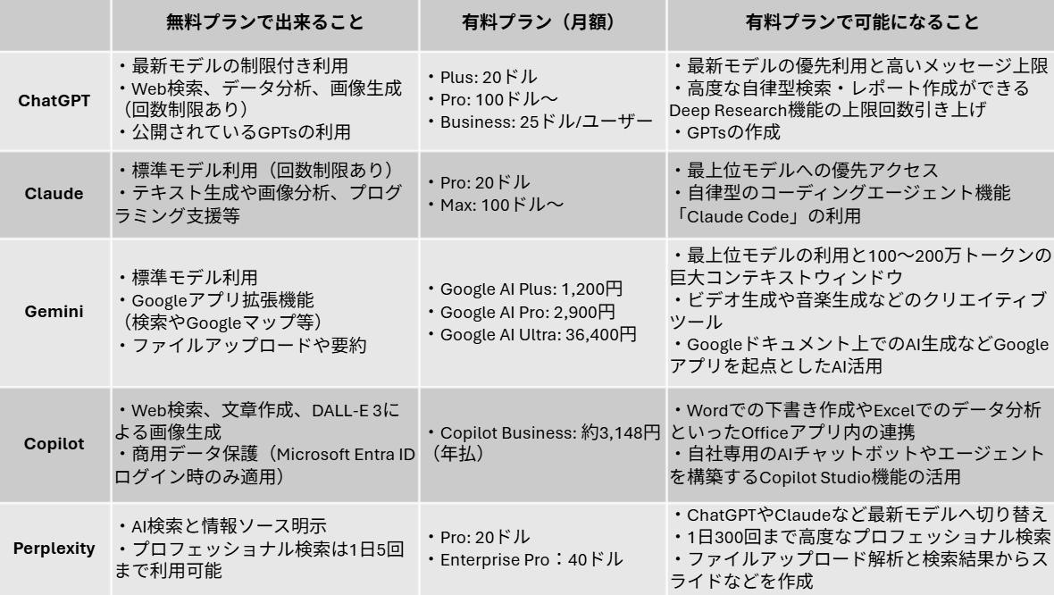 🔍主要な生成AIサービスの比較