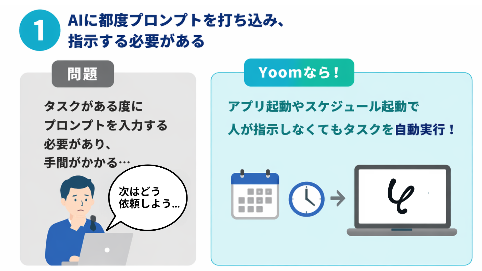 しかしYoomの場合、これらの指示をアプリ起動やスケジュール起動など、人間が指示しなくともタスクを実行できます。