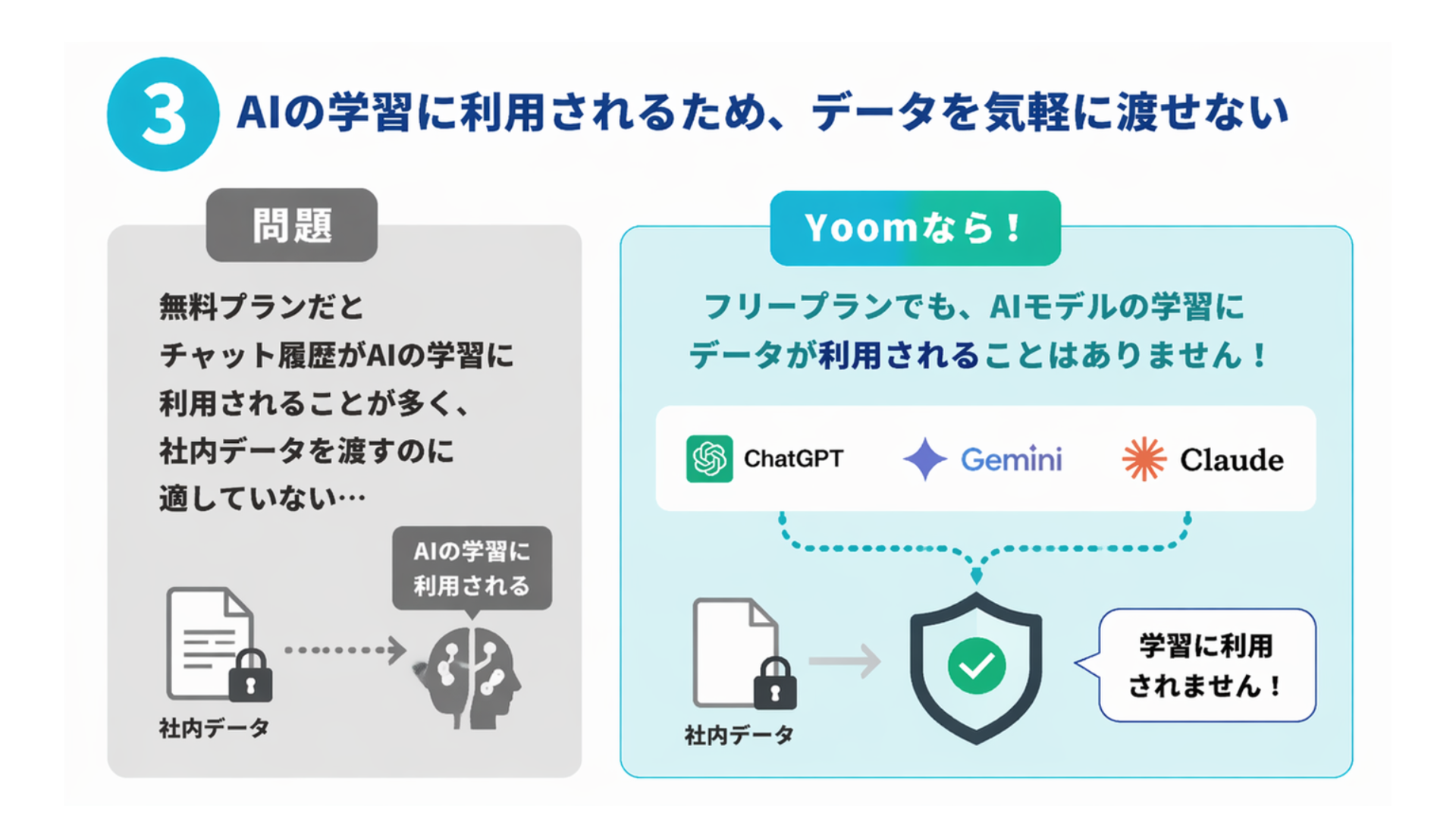 一方、Yoom内でChatGPT・Gemini・ClaudeといったAIモデルを使用する場合、無料で使えるフリープランでもAIモデル学習にデータが利用されることはありません。