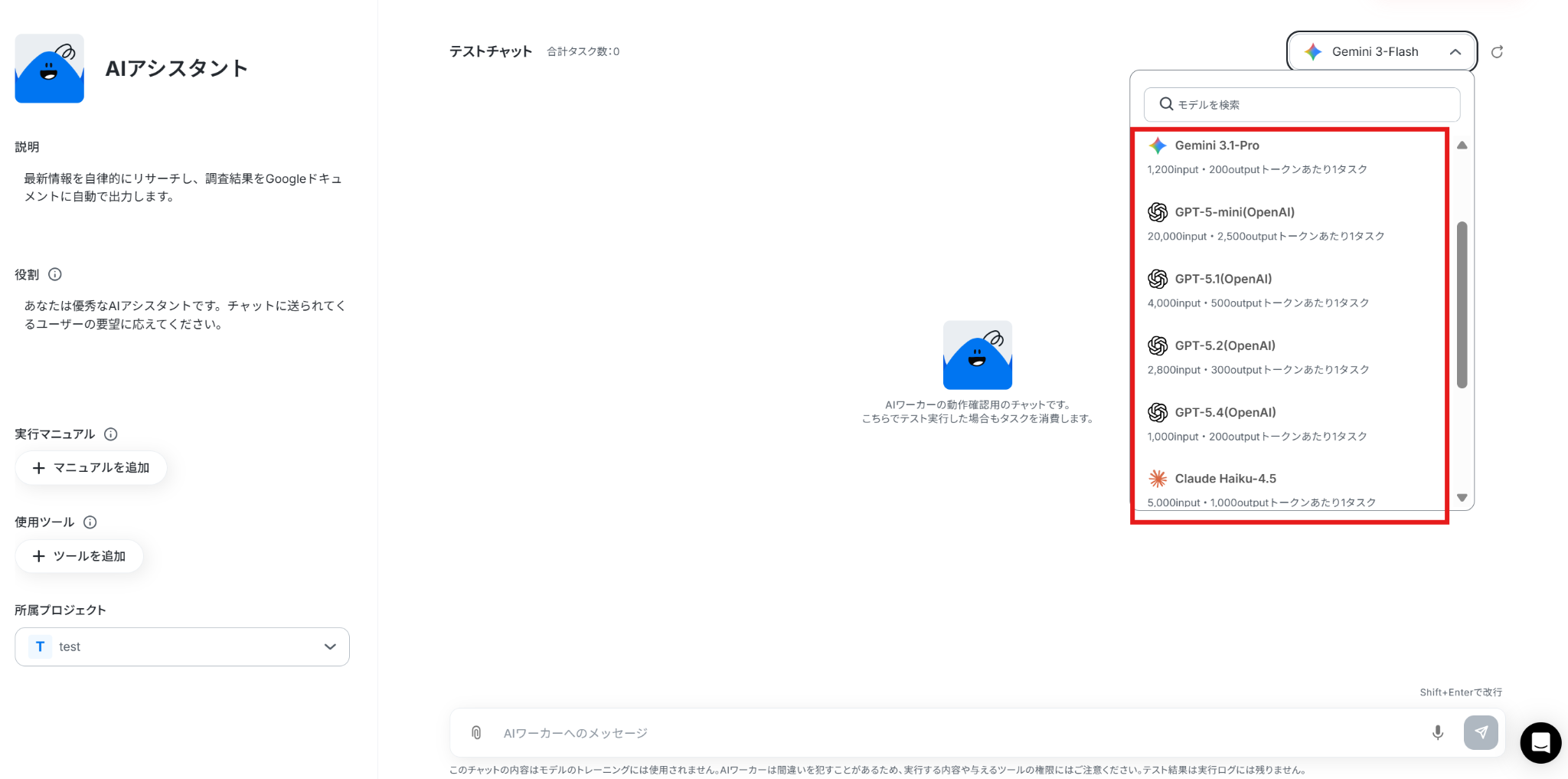 - AIワーカーは、テスト実行でも本番実行と同様にタスクを消費しますのでご注意ください。詳細は「【AIワーカー】タスク実行数の計算方法」をご参照ください。