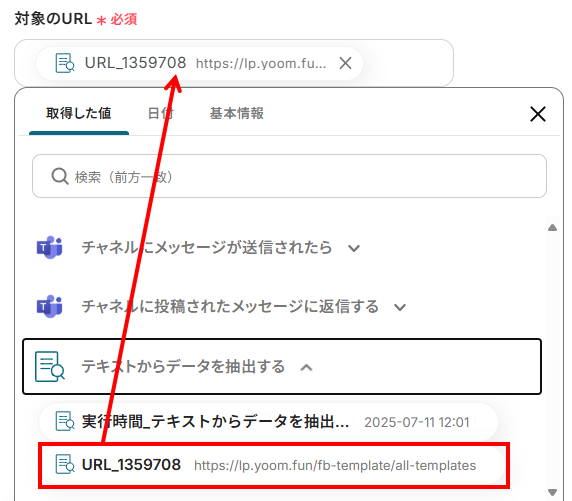 1.続いて、前のステップでアウトプットしたMicrosoft Teamsのテキストを、AIを用いてURLのみ抽出する設定を行います。
