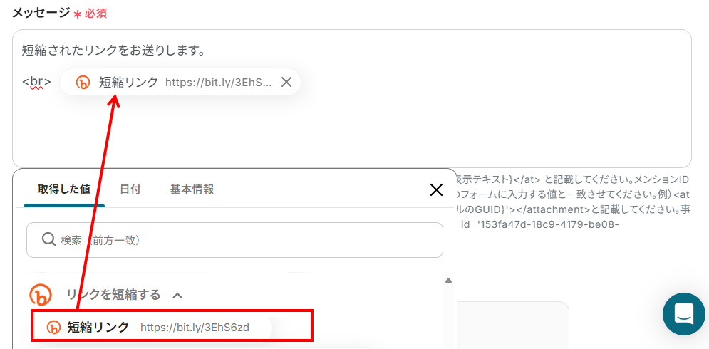 - メッセージ:メッセージ入力欄をクリックすると、アウトプットが表示されます。下記画像のようにBitlyで作成した短縮リンクを入力したり、お好みでカスタマイズしてください。