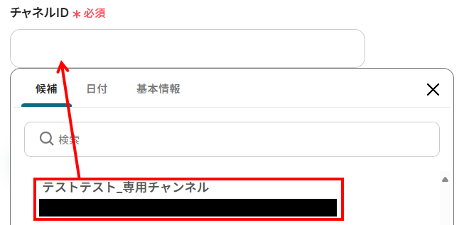 - チームID・チャネルID:該当欄をクリックすると候補が表示されますので、ステップ3で設定したものを選択します。