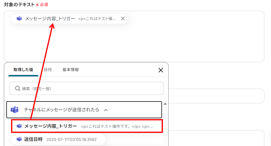 - 対象のテキスト:入力欄をクリックすると下記のようなアウトプットが表示されます。先ほど抽出したMicrosoft Teamsのメッセージ内容をそれぞれ選択しましょう。