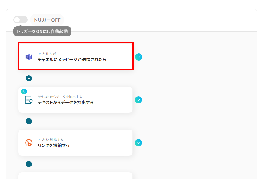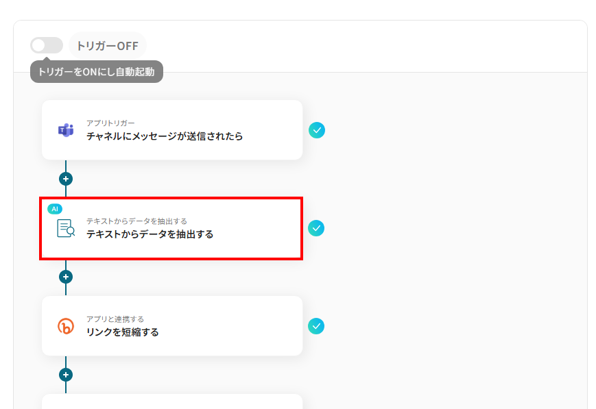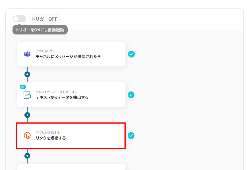 - Microsoft Teamsのトリガー設定、AIによるテキスト抽出設定、Bitlyのアクション設定