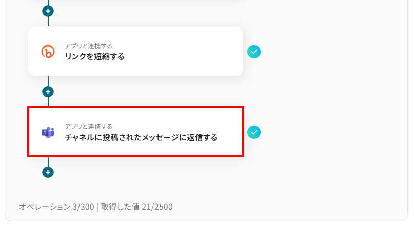 このワークフローは、BitlyのAPI連携を活用することで、Microsoft Teamsに投稿されたURLを自動で検知し、短縮URLを生成して返信する作業を自動化します。